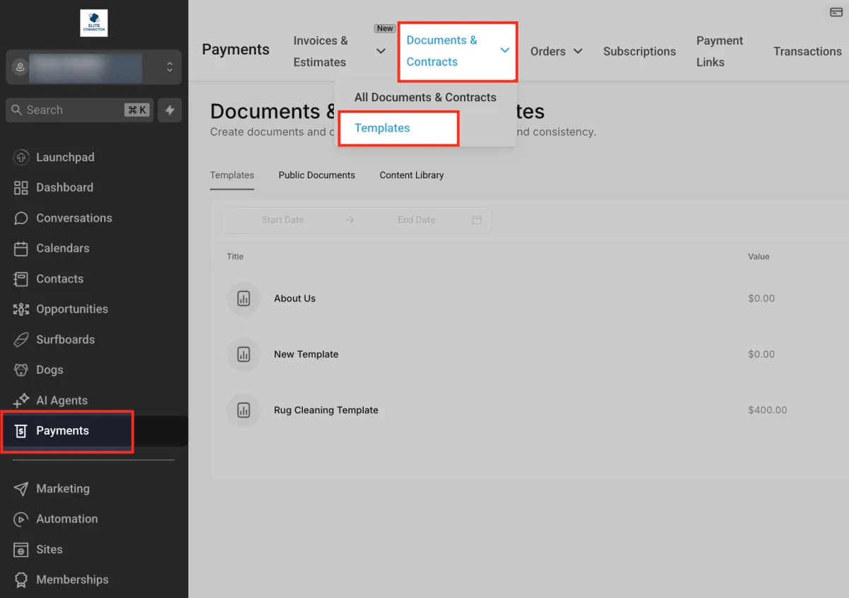 Go to the Payments tab, open the Documents & Contracts dropdown, and select Templates. This view lets you access or manage templates used to create signable documents.
