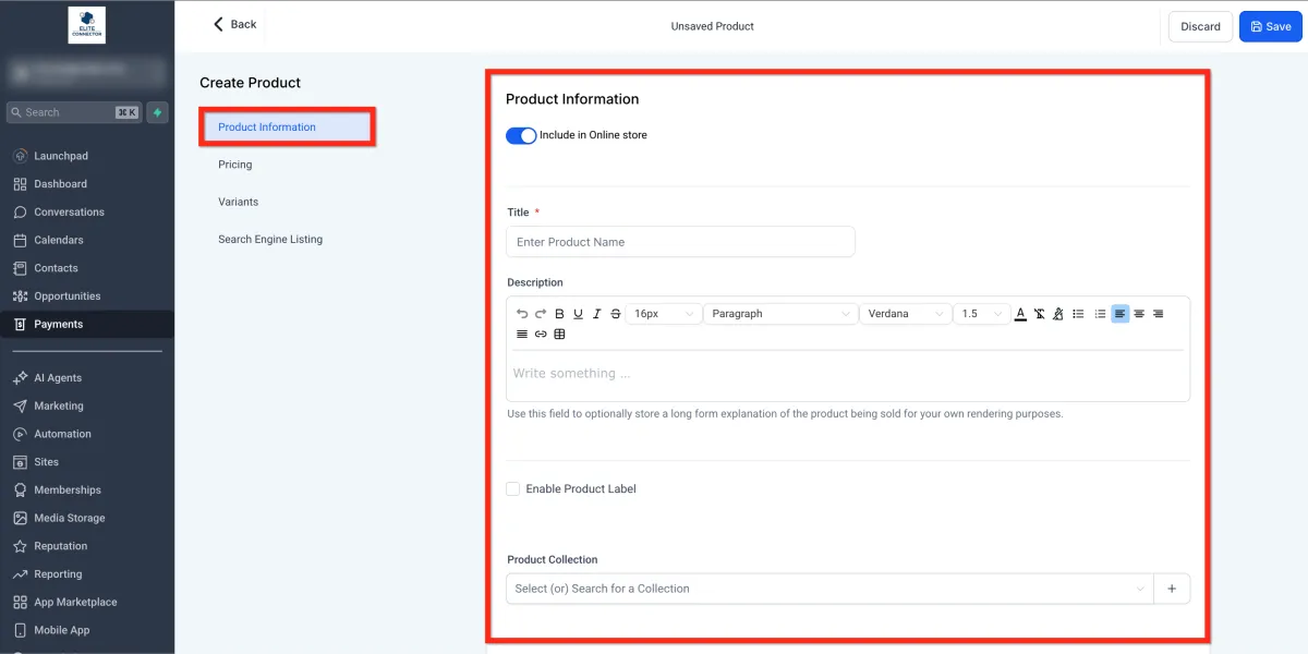 3.Fill in Product Information: The Product Information section is where you define the foundational details for your product.