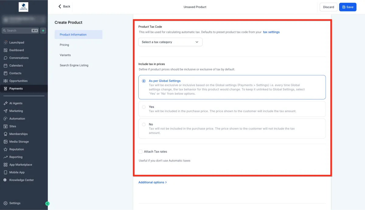 4. Configure Tax Options: The Product Information section includes several key fields to define how the product is presented and taxed.