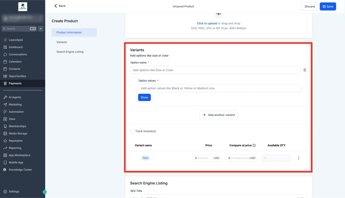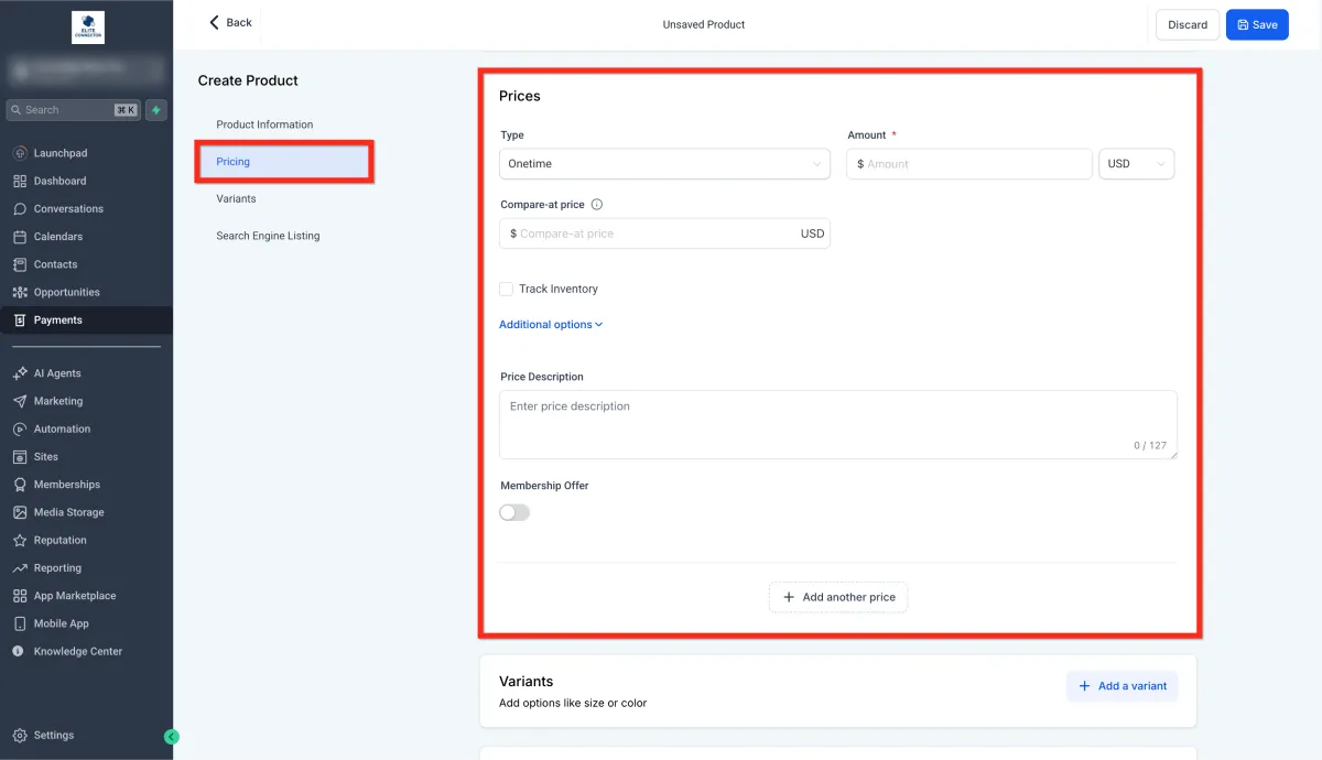 1.Add Product Variants: The “Variants” section lets you create different versions of a product, such as multiple pricing tiers, content levels, or access durations.