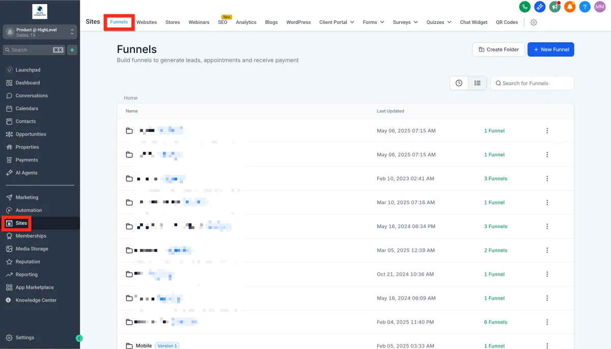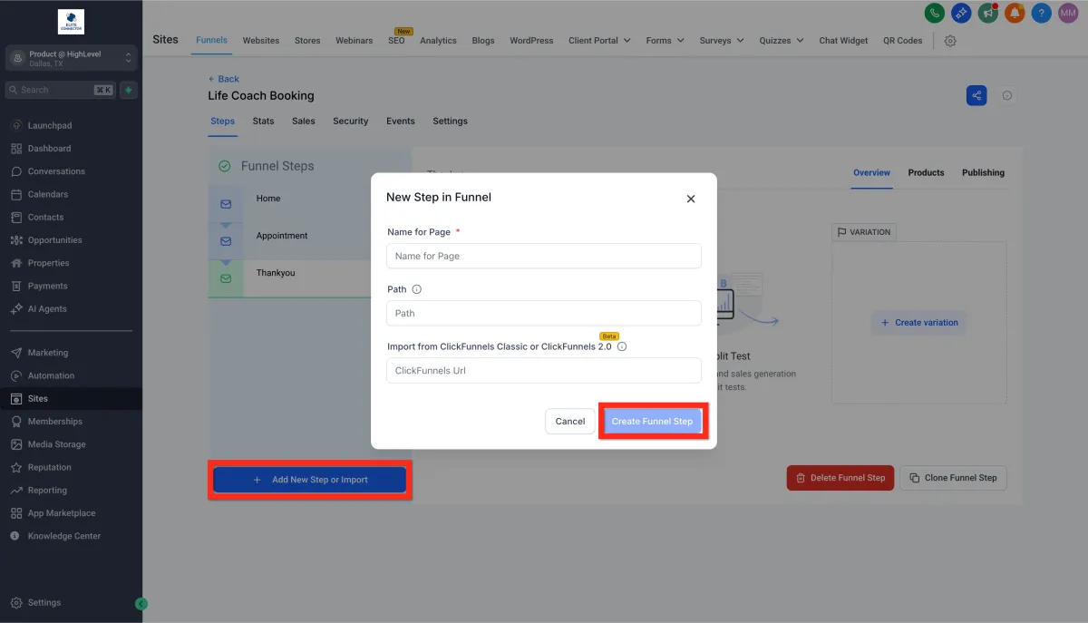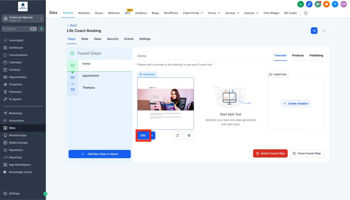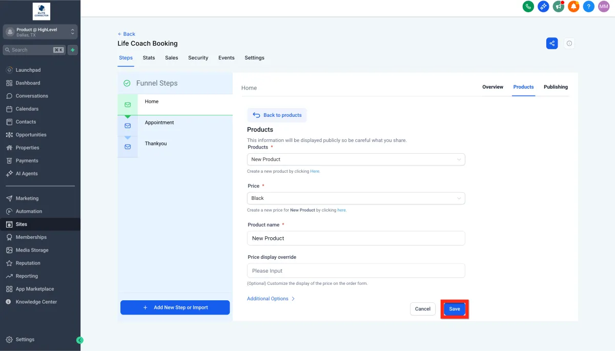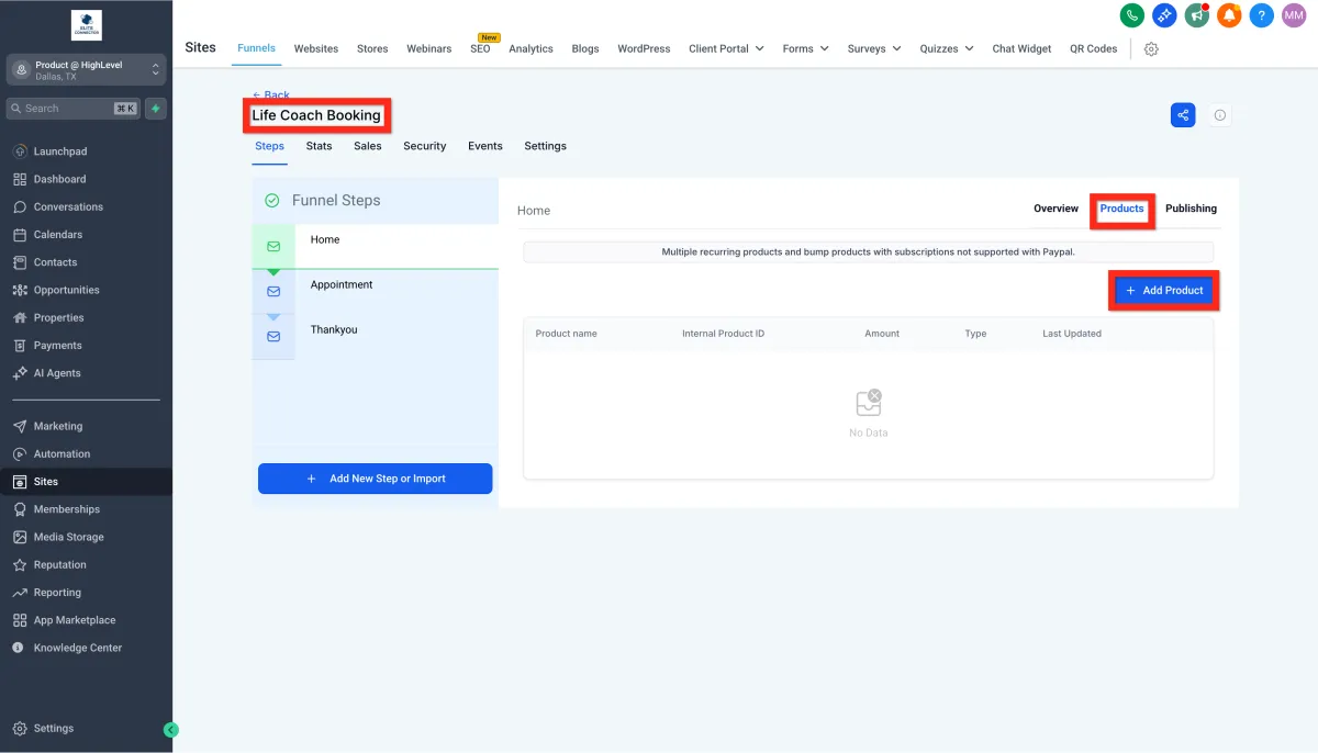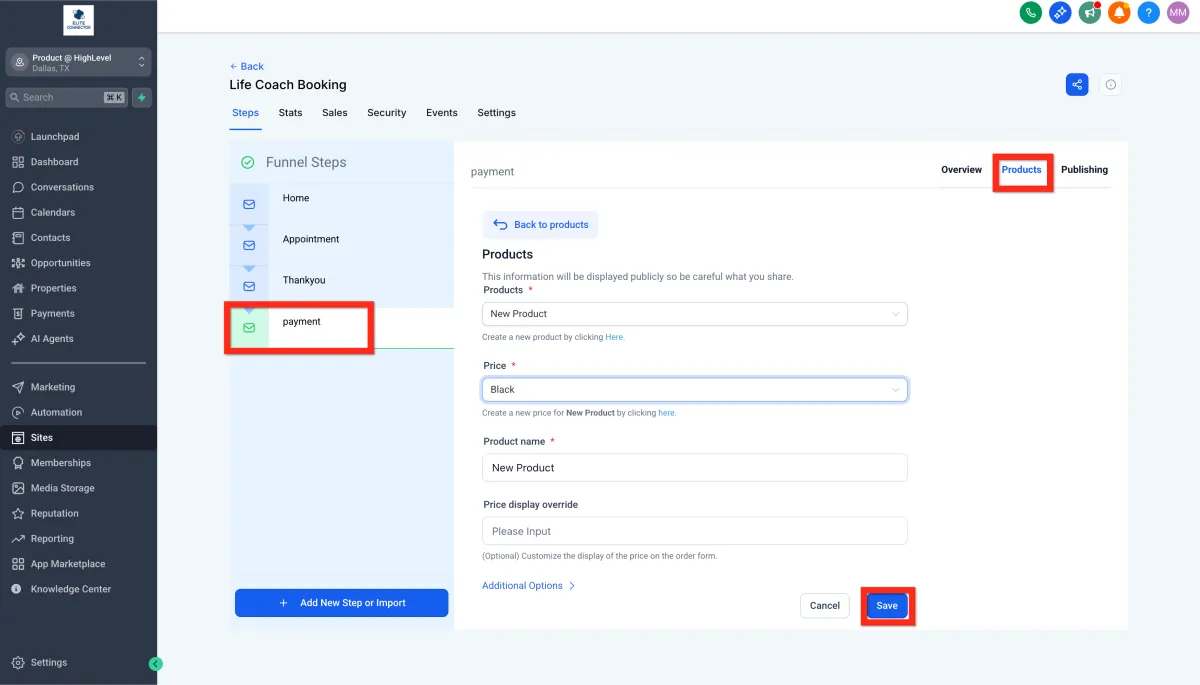 . Navigate to Sites and choose where you want your product to appear: Website, Funnel, or Store.