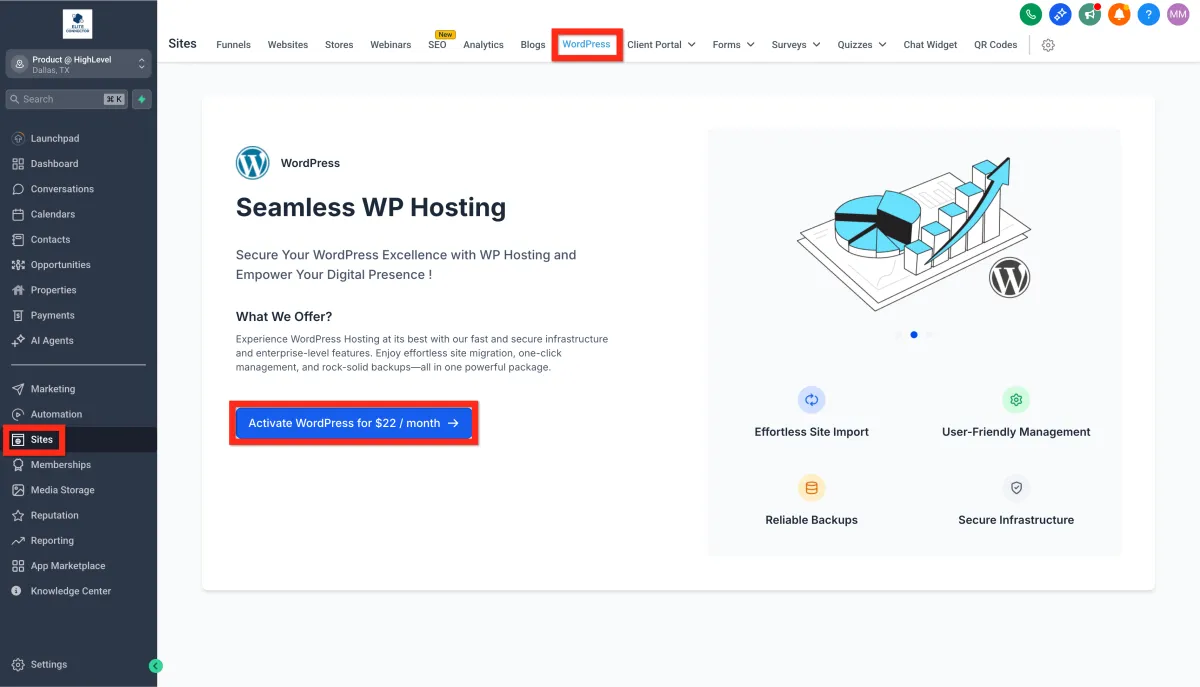 First things first, go ahead and click on Sites > WordPress. This will get us on the right path to creating your new home for your existing site