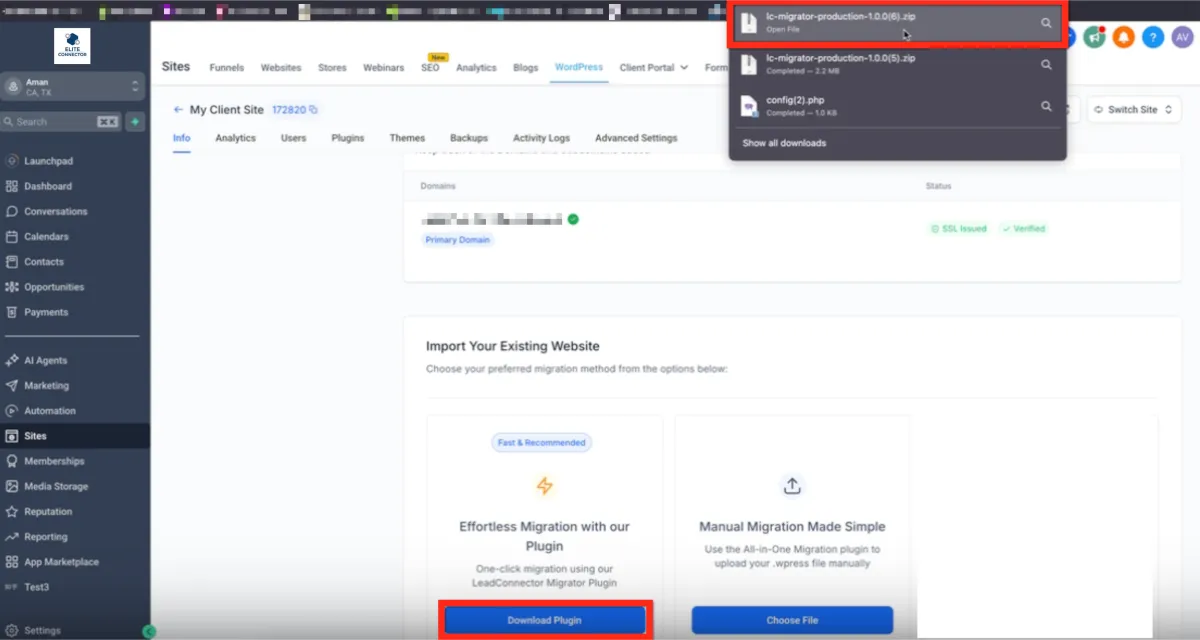 Under your Wordpress site > Info > Import Your Existing Website, select the One-click migration using LeadConnector Migrator Plugin. Make sure the zip is downloaded. Now, here comes the magic!