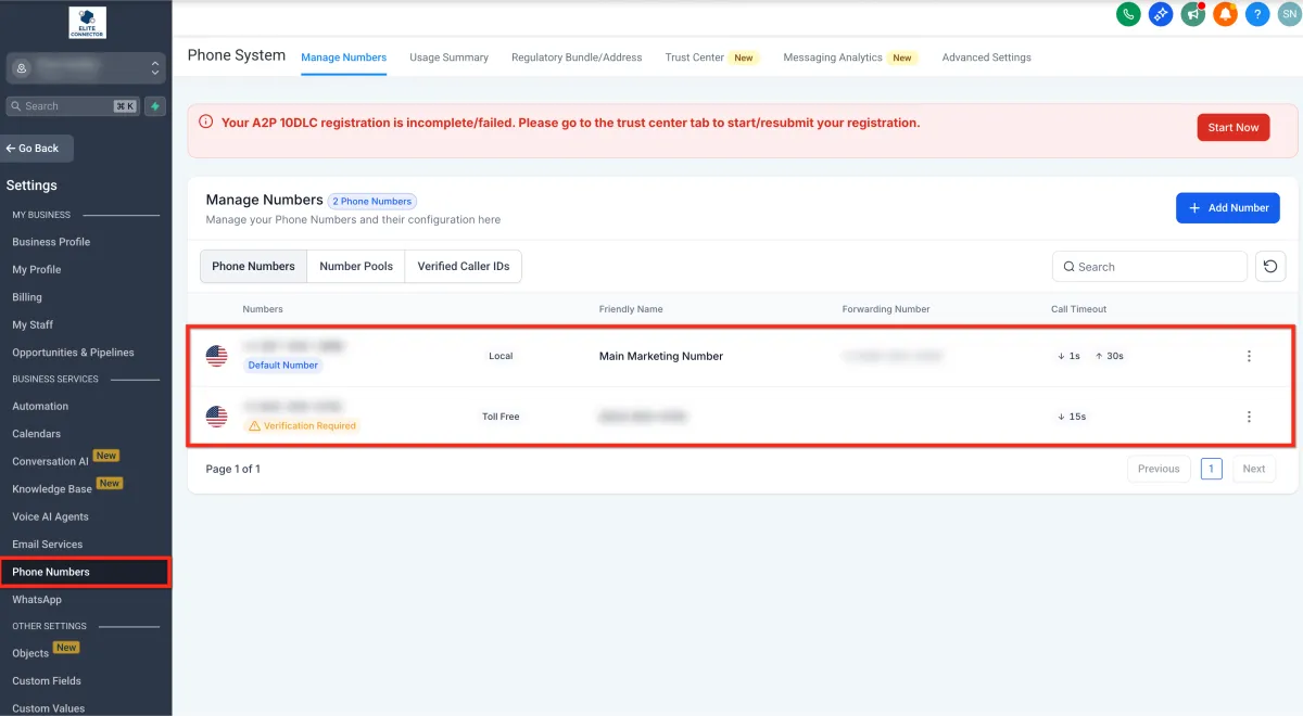 3. List of available numbers for the sub-account will show under ManageNumbers tab.