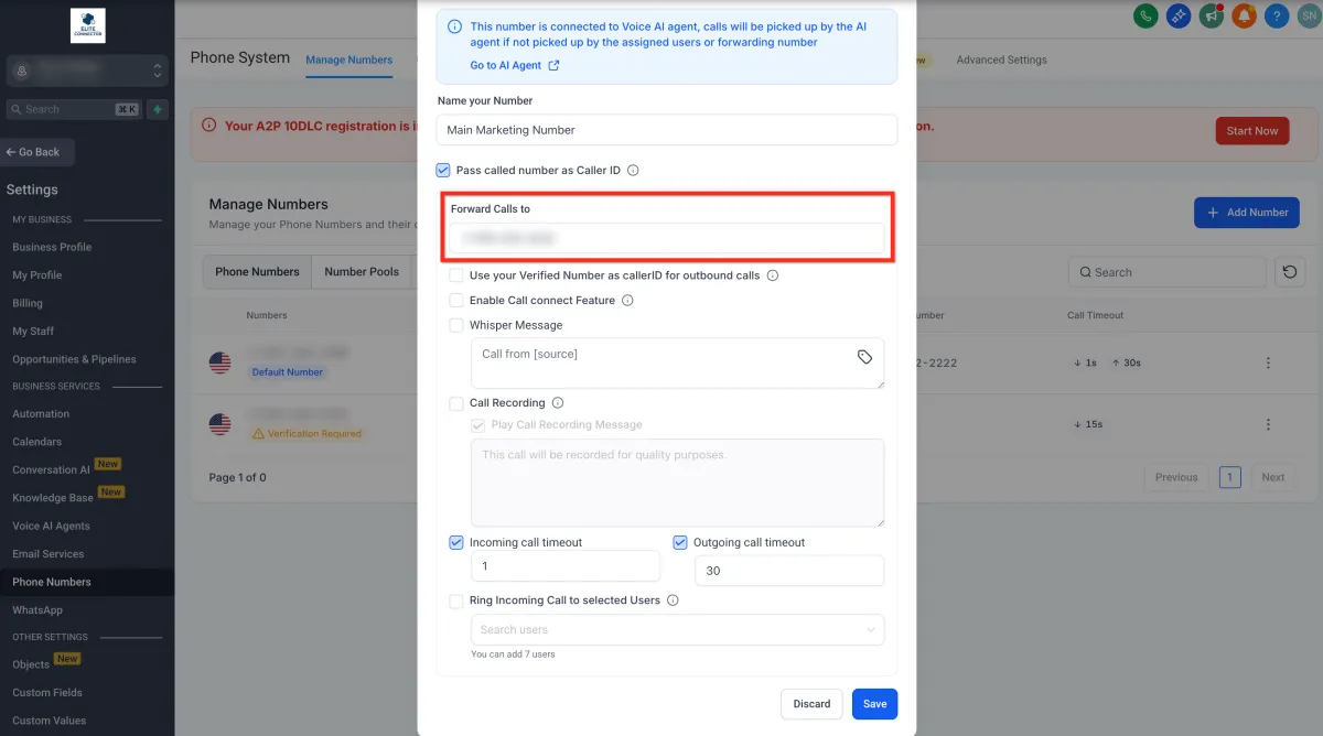 Assign call forwarding to the phone number assigned to your AI Agent.
