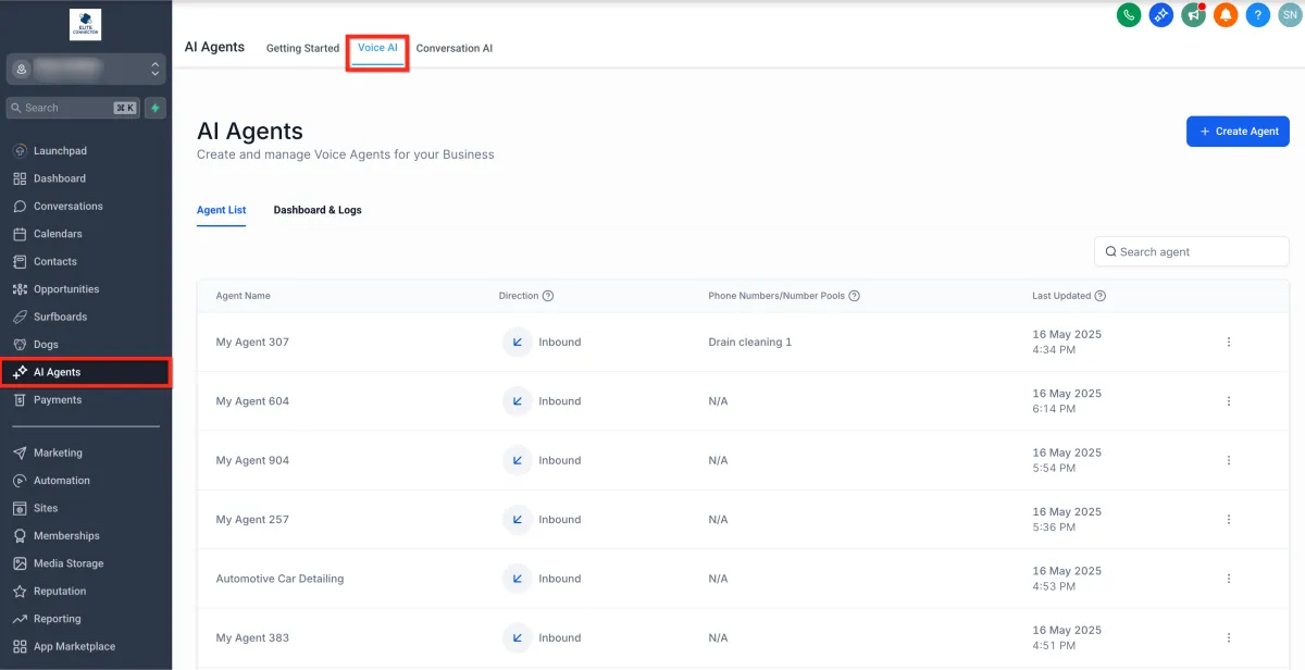 From your HighLevel account, click on AI Agents and then on Voice AI option.